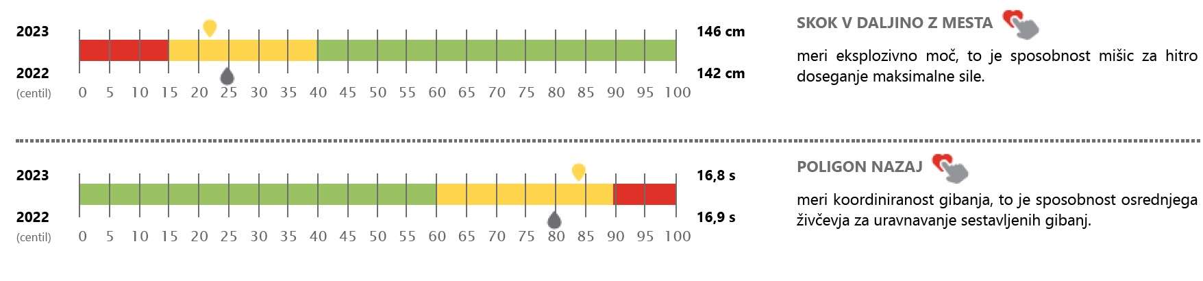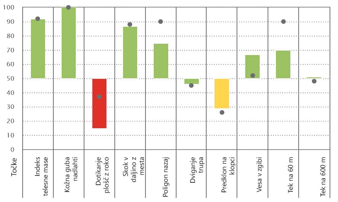 Pomembno je upoštevati, da je pri določenih merskih nalogah zaželena višja vrednost rezultata, npr. pri upogibanju trupa, skoku v daljino z mesta ali vesi v zgibi, pri določenih nalogah pa nižja vrednost, npr. pri poligonu nazaj in teku na 60 m ali 600 m. Pri slednjih nalogah torej nižji centil pomeni boljši rezultat v primerjavi z vrstniki. Enako kot na prvem diagramu, so tudi tukaj rezultati opredeljeni z barvo, ki nakazuje, če je rezultat koristen za zdravje (zelena) ali pa ga je treba izboljšati (rumena in rdeča).